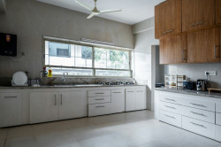 - Brug ensfarvede fliser som baggrund for mønstrede elementer – fx et farverigt køkken eller en markant vask.